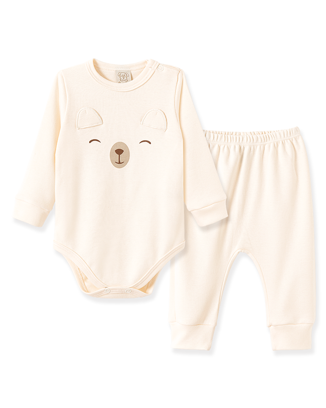 Delicado e versátil, este conjunto bebê é perfeito para compor looks suaves e cheios de aconchego.O body de manga longa em tom off white possui estampa minimalista de rostinho de ursinho na parte frontal, trazendo um charme sutil e elegante à peça. Conta com botões no ombro que facilitam na hora de vestir e fechamento por botões de pressão entre as pernas, garantindo praticidade no dia a dia.