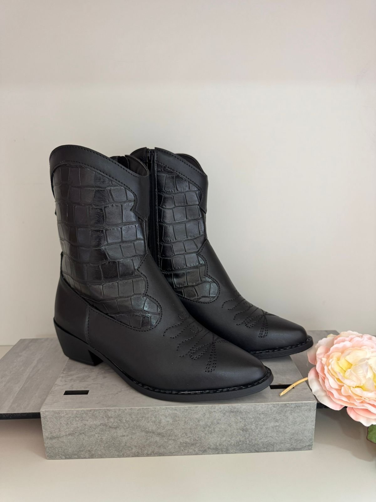 Confeccionada em material sintético de alta qualidade, possui recortes com textura croco que adicionam um toque fashion e elegante. O fechamento em zíper lateral facilita o calce, garantindo praticidade no dia a dia.