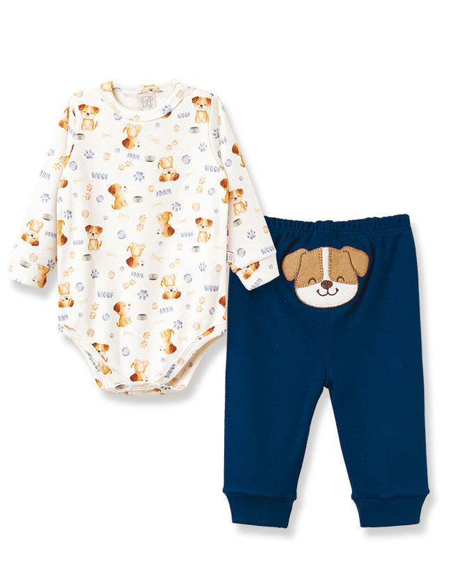 O body de manga longa em tom claro possui estampa de cachorrinhos, patinhas e ossinhos, trazendo um toque lúdico e alegre à peça. Confeccionado em tecido macio, garante conforto e liberdade de movimentos para acompanhar o bebê em todos os momentos.