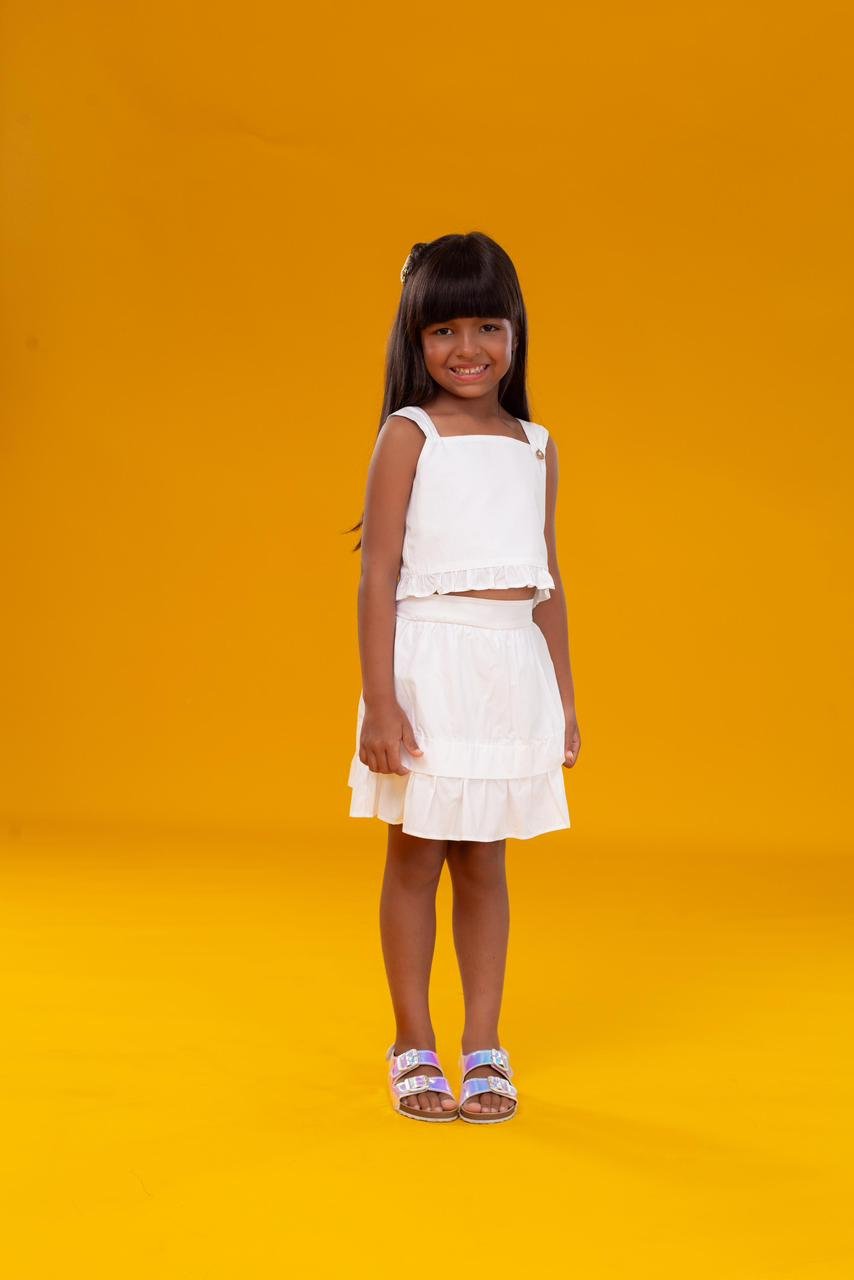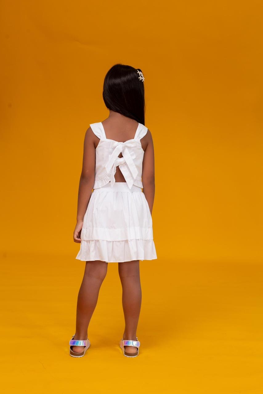 Conjunto infantil feminino em tecido de algodão, blusa com decote reto, alças, babadinho na barra, decote nas costas com amarração. Saia com cós de elástico rebatido, prega e babado na barra. Short de malha por baixo.