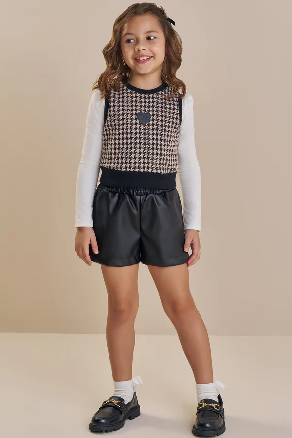 O colete em estampa pied de poule traz um toque clássico e elegante, enquanto a blusa de manga longa garante conforto e suavidade ao vestir. Já o short com acabamento em couro eco adiciona um ar contemporâneo e cheio de atitude ao visual.