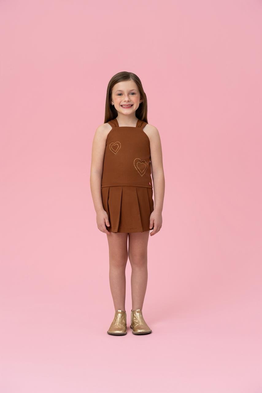 A blusa possui modelagem ajustada, alças mais largas e detalhe de aplicação em formato de corações na parte frontal, trazendo um toque delicado e romântico. A saia apresenta modelagem plissada, garantindo movimento e um visual estiloso.