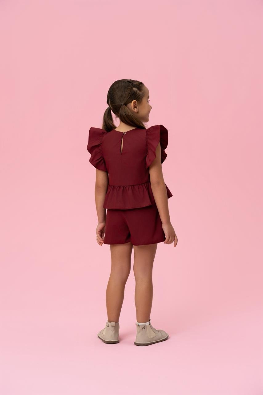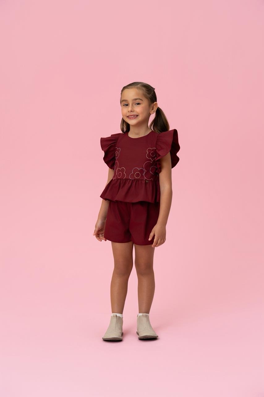 A blusa possui modelagem soltinha, mangas com babados e detalhe de bordado floral na parte frontal, trazendo um toque romântico e delicado à peça. O acabamento com leve peplum valoriza ainda mais o caimento.