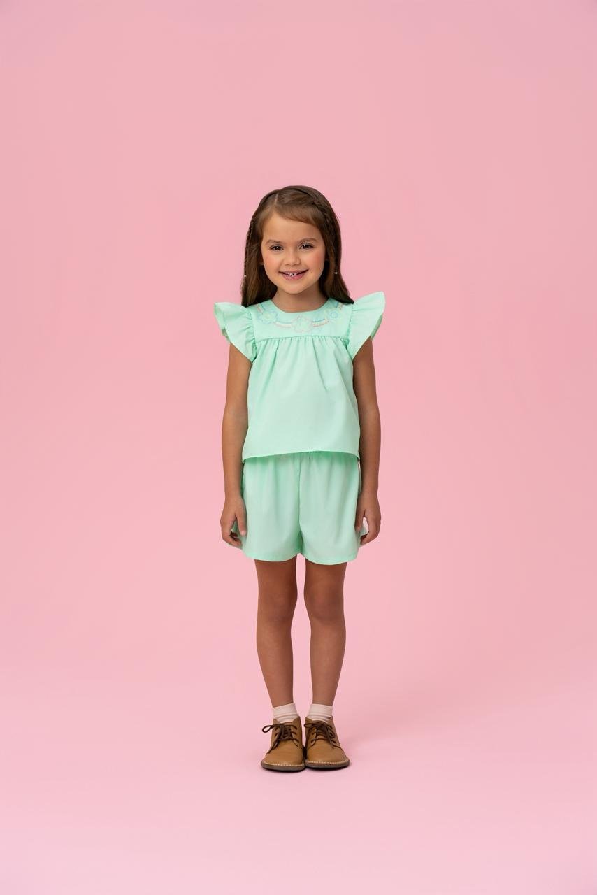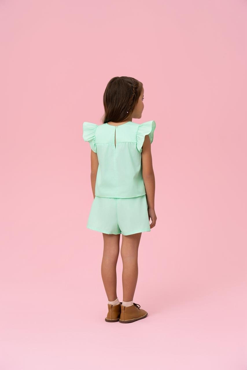 A blusa possui modelagem soltinha, mangas com babados e detalhe delicado na parte superior, trazendo um charme extra à peça. O short complementa o conjunto com caimento confortável e liberdade de movimento.