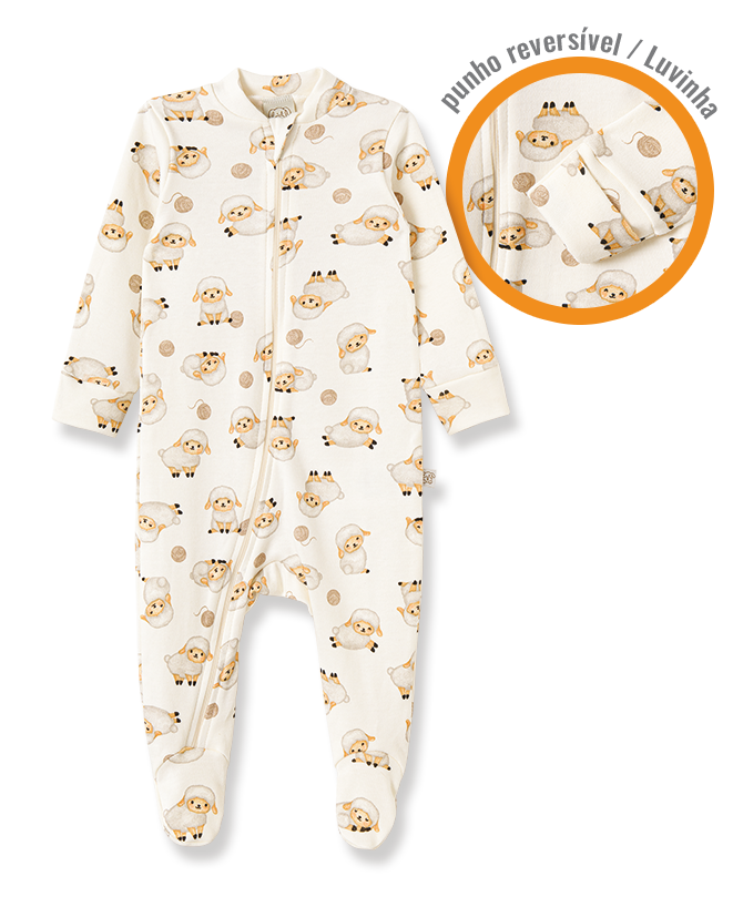 O grande diferencial da peça é ser dupla face (reversível), oferecendo duas opções de uso em um único macacão — mais versatilidade para o dia a dia. De um lado, a delicada estampa de carneirinhos traz um charme especial e um visual lúdico e encantador.