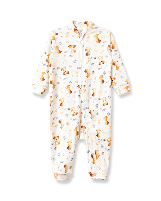 Conta com fechamento frontal, facilitando na hora de vestir e nas trocas. A estampa traz adoráveis cachorrinhos em tons de caramelo, combinados com patinhas, ossinhos e bolinhas em azul e bege, sobre fundo branco, deixando a peça ainda mais charmosa.