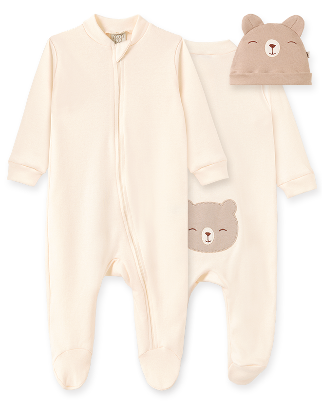 O modelo conta com fechamento frontal, facilitando na hora de vestir e nas trocas. Possui pezinho fechado, mantendo os pés sempre aquecidos, e um detalhe encantador de ursinho aplicado na parte de trás, trazendo ainda mais fofura à peça.