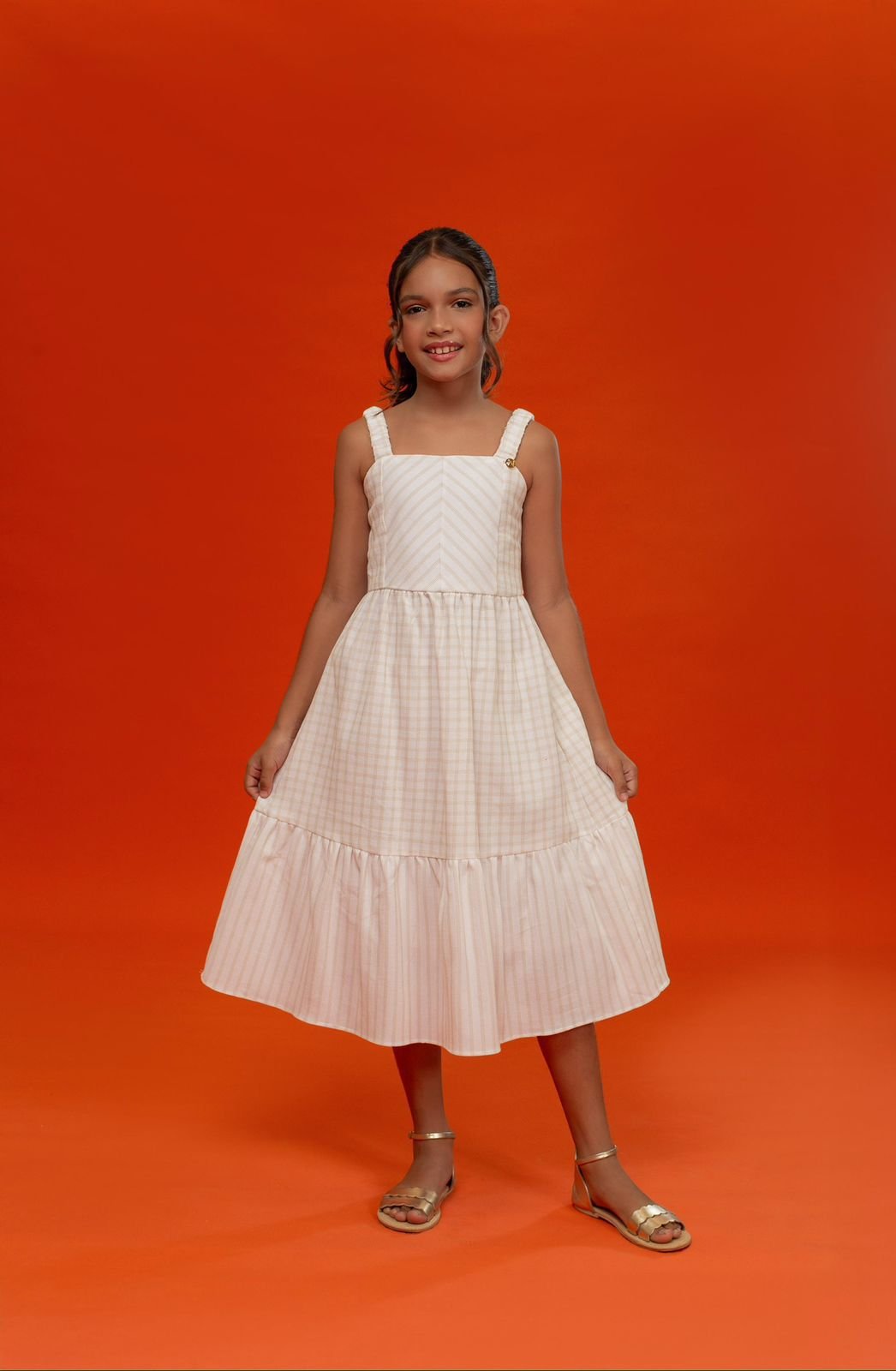 VESTIDO ESTAMPA XADREZ E LISTRAS BEGE