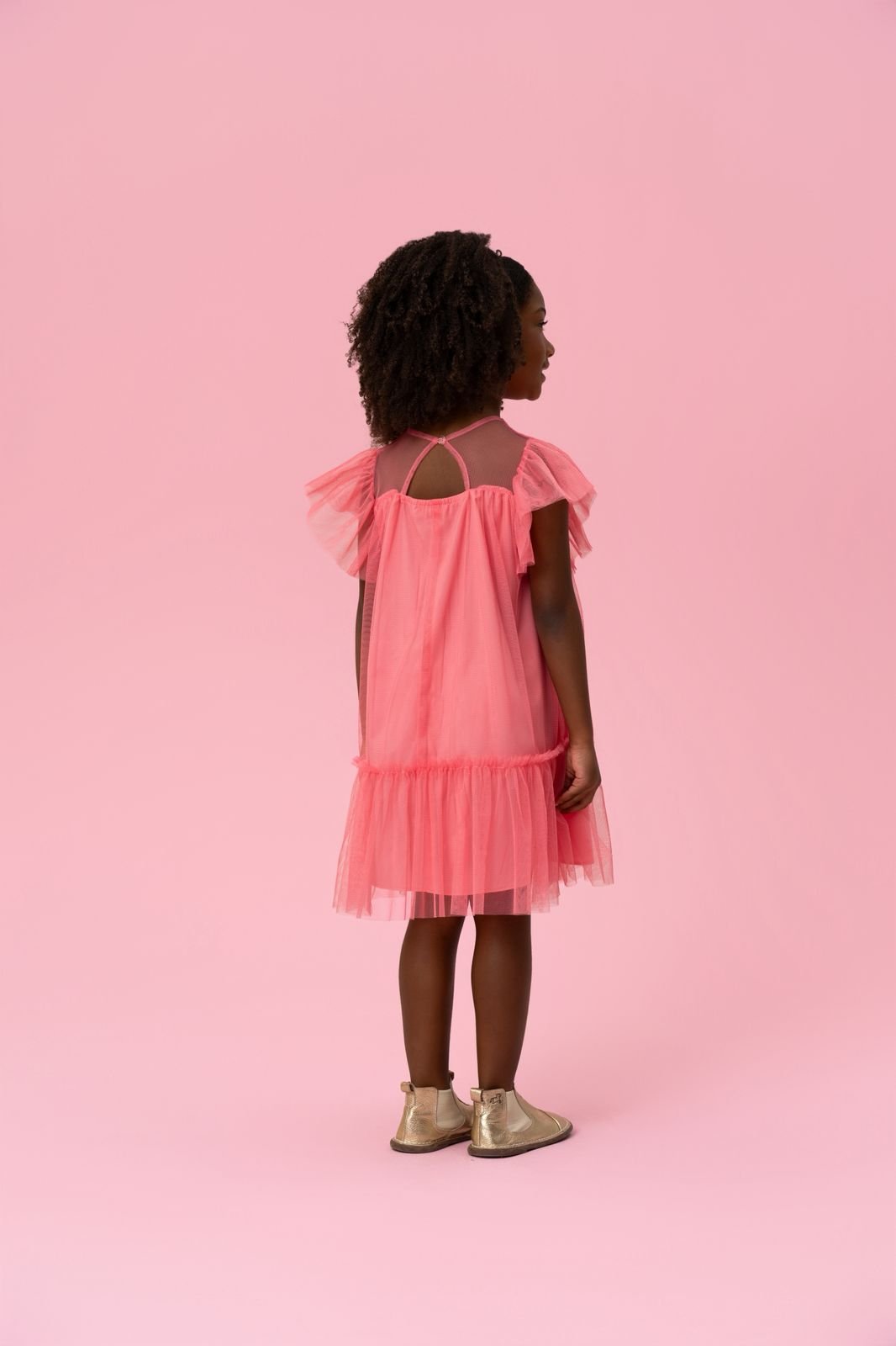 A sobreposição em tule e o acabamento com babado na barra completam o visual com leveza e elegância, tornando o vestido ideal para festas, passeios e momentos especiais.