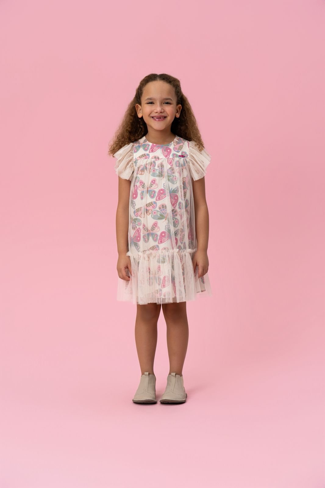 O modelo conta com mangas em tule com leve transparência, decote redondo e modelagem soltinha com recorte franzido, trazendo movimento e um visual delicado. O destaque fica por conta da estampa de borboletas em tons suaves, que adiciona um toque lúdico e encantador à peça.