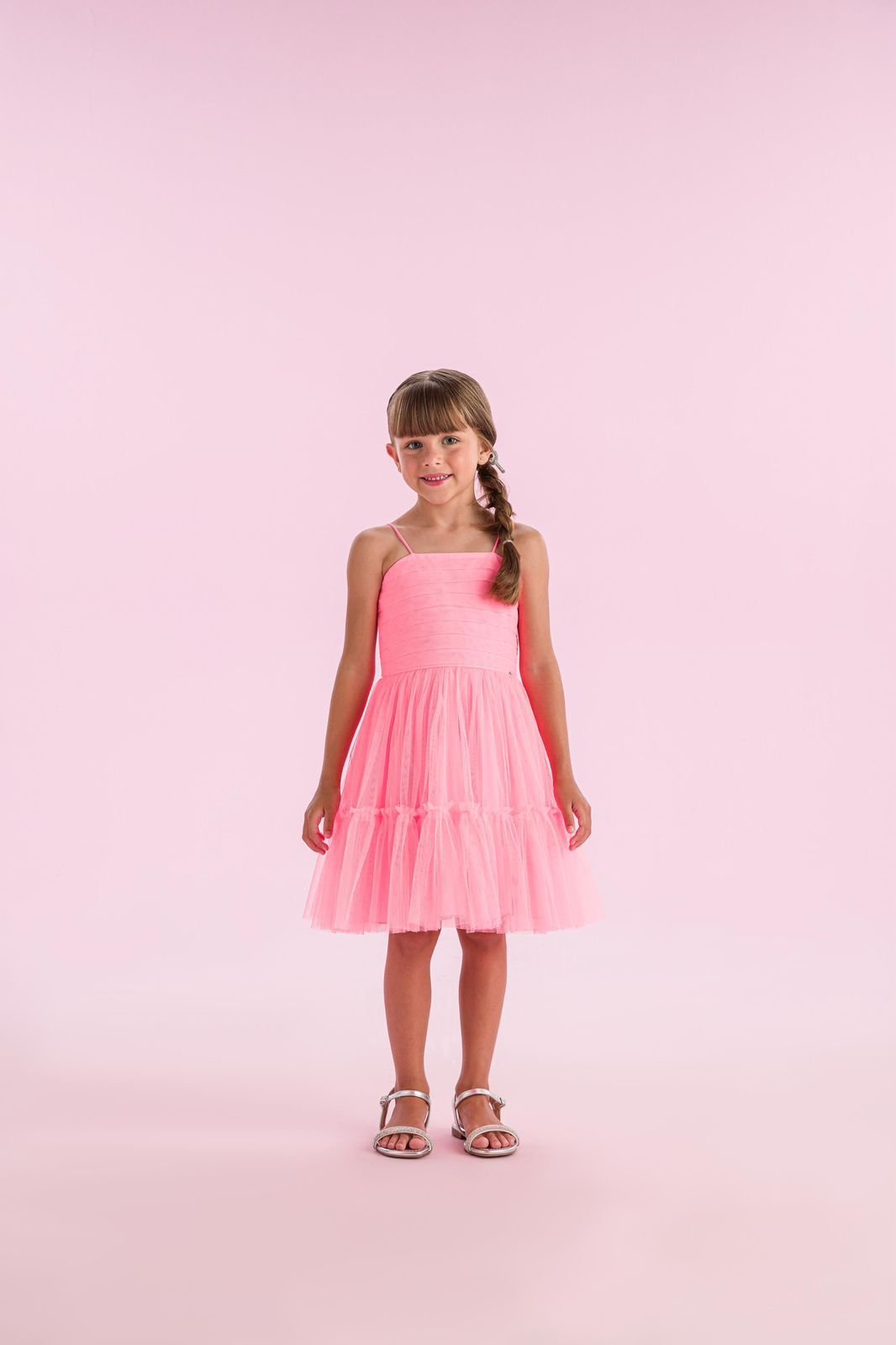 O modelo possui alças finas e corpo ajustado, garantindo conforto e ótimo caimento. A saia em camadas de tule traz volume na medida certa, criando um efeito fluido e cheio de movimento, que deixa a peça ainda mais charmosa.